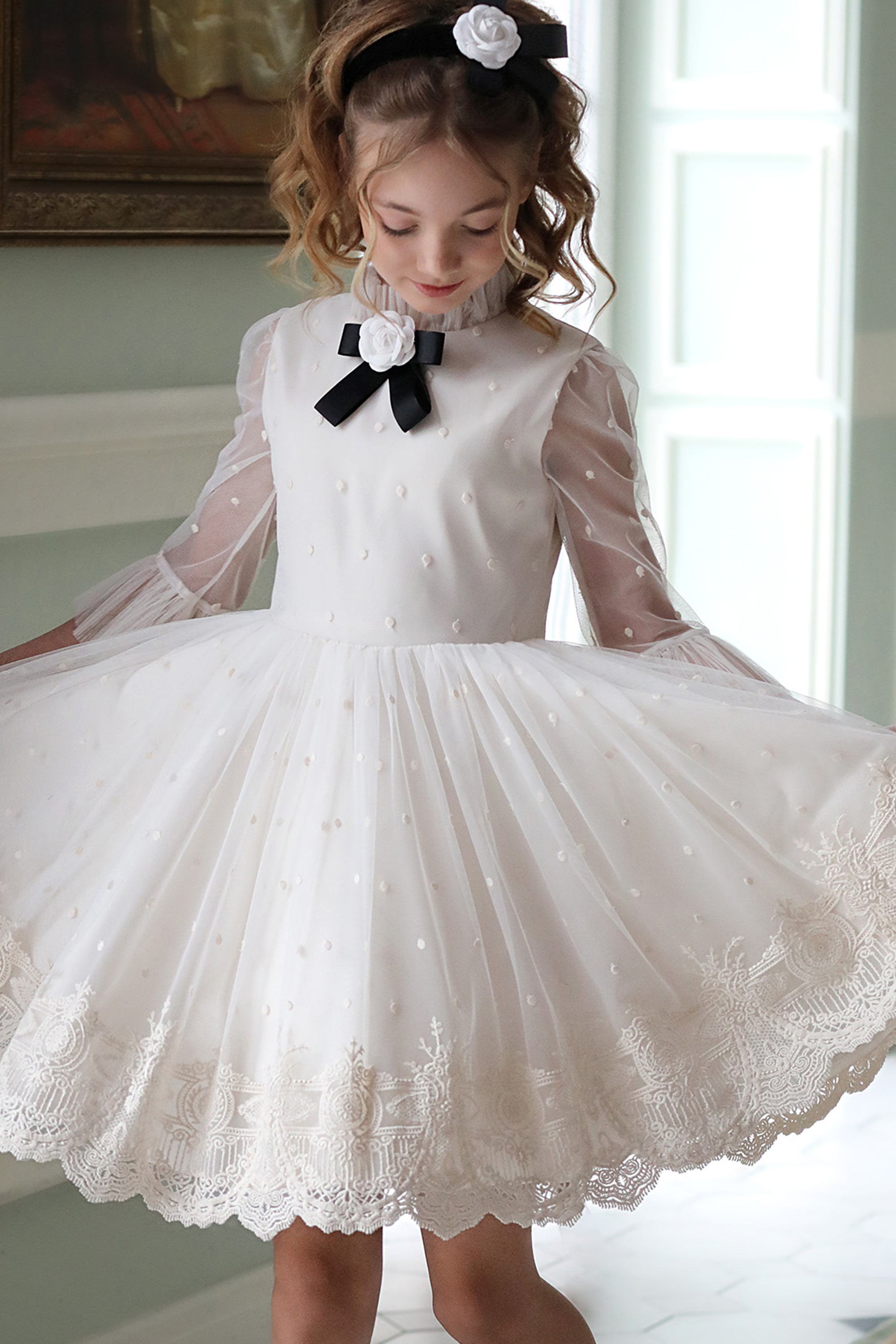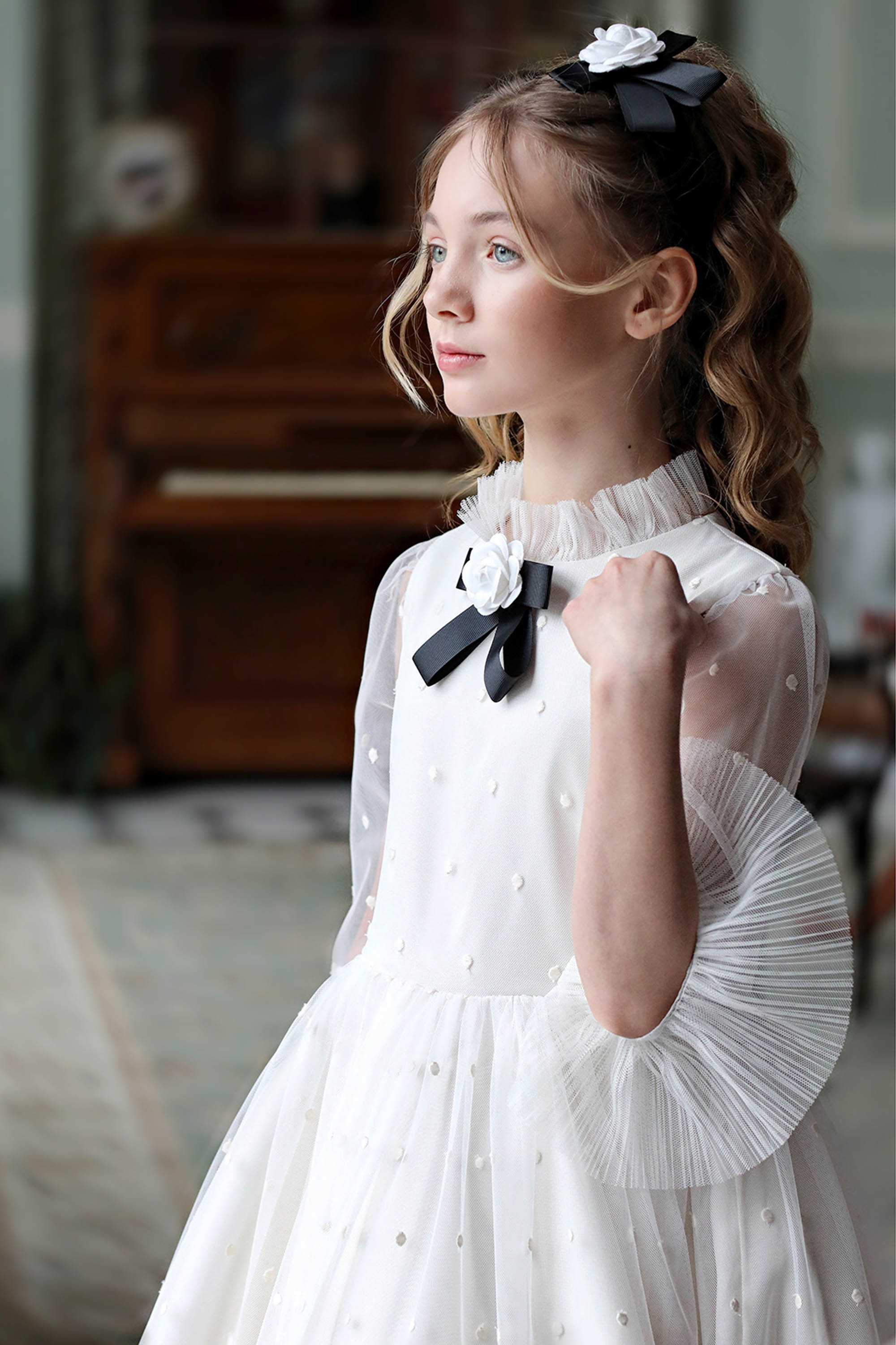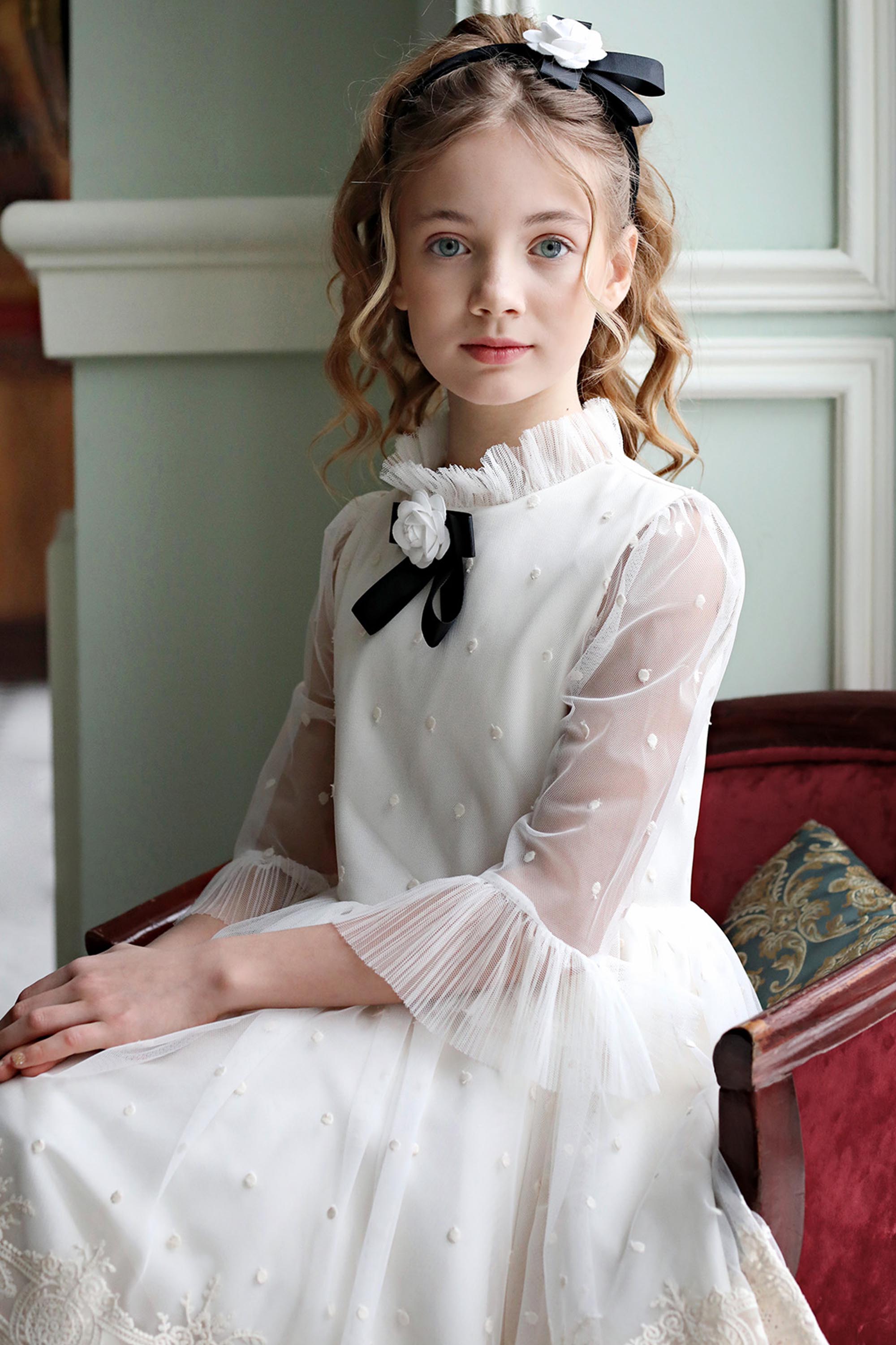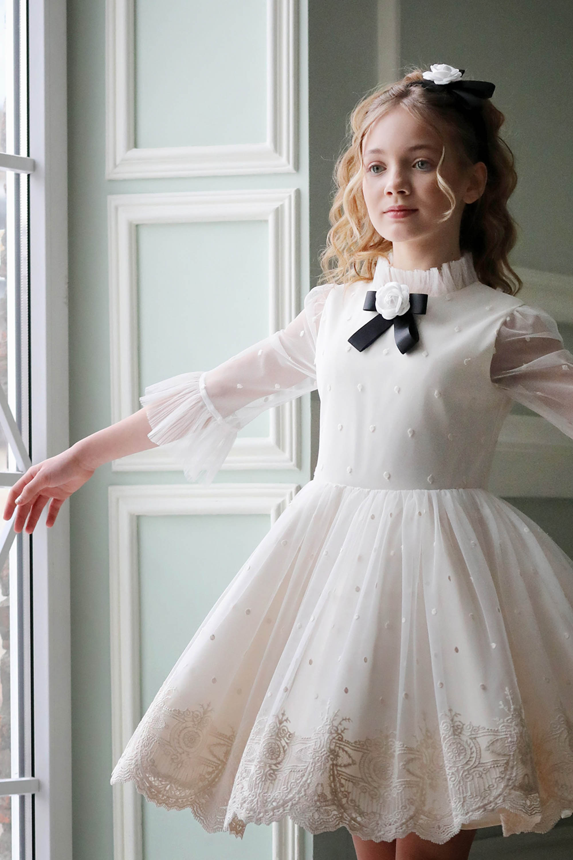 Изящный воротничок с оборками, прозрачные рукава и брошь с цветочным бантом придают этой модели безупречную элегантность.