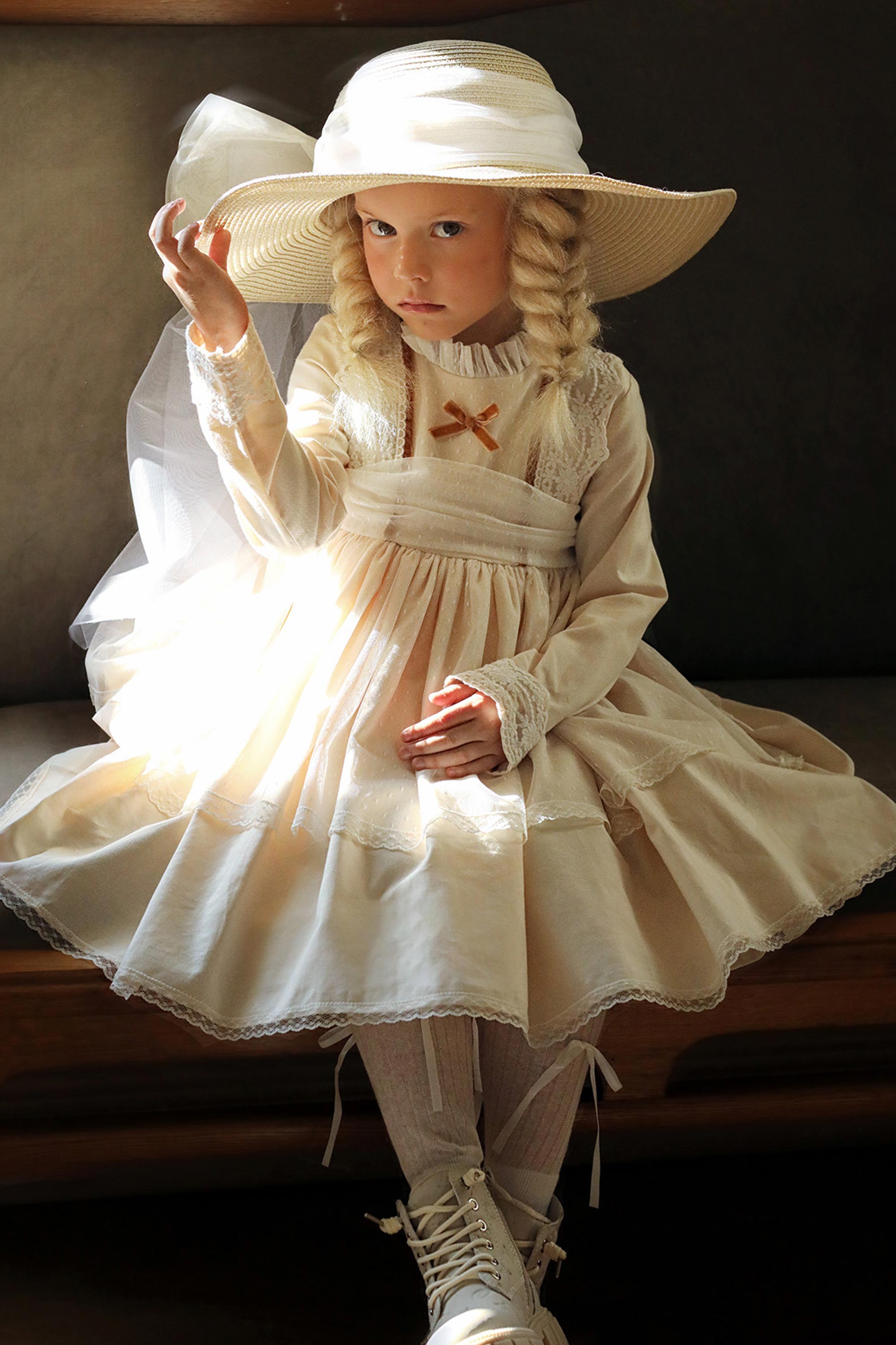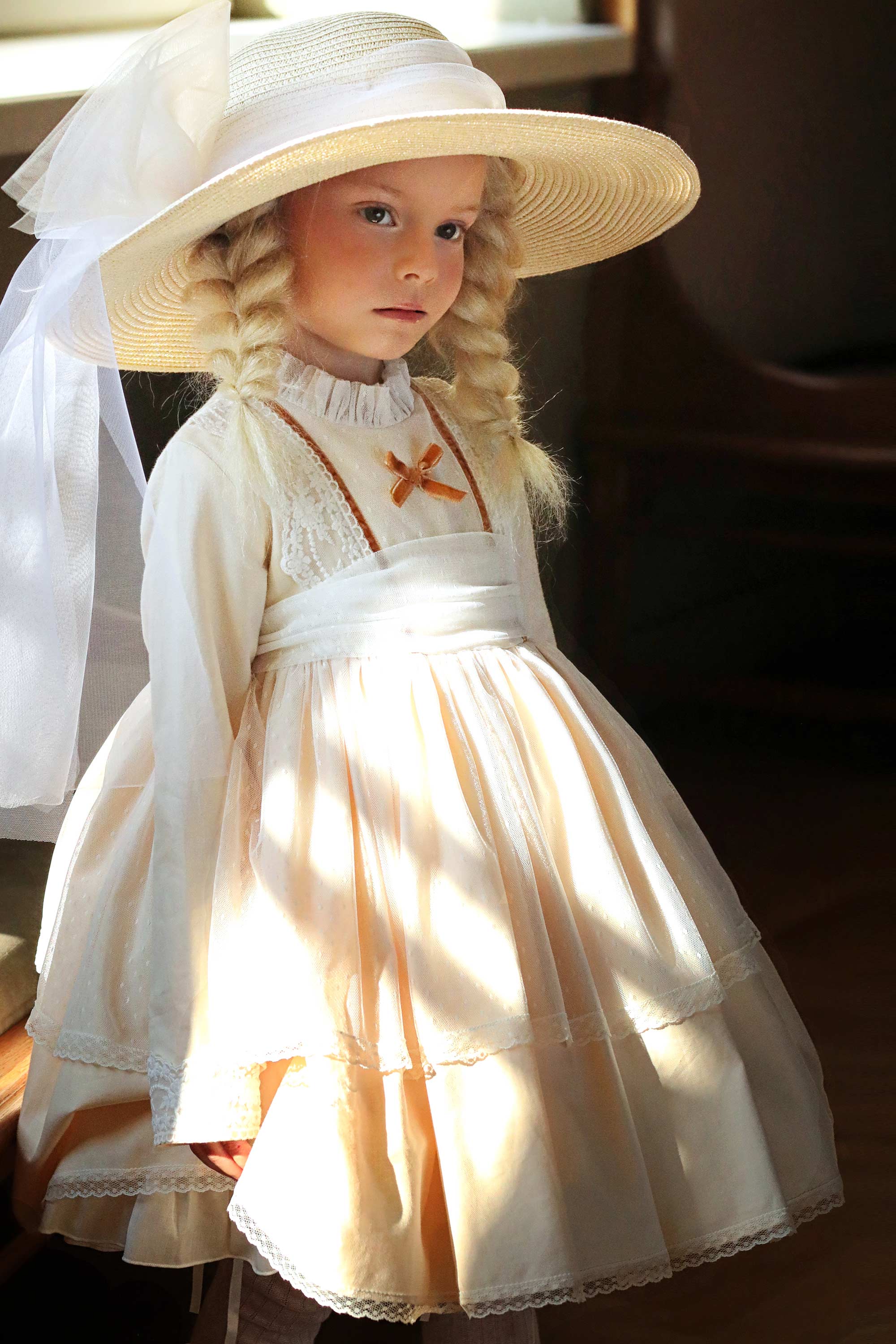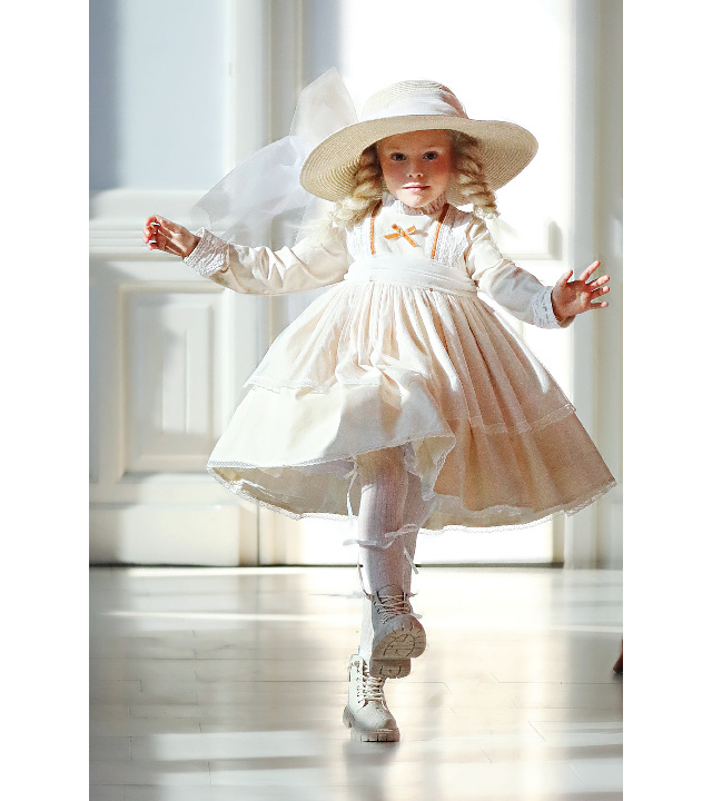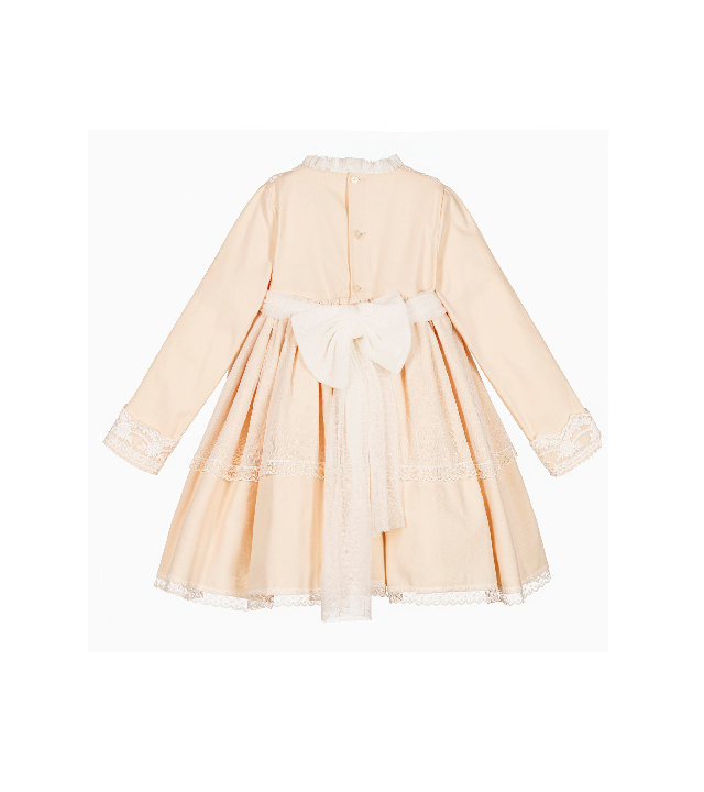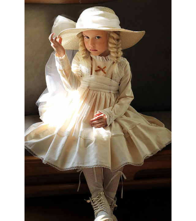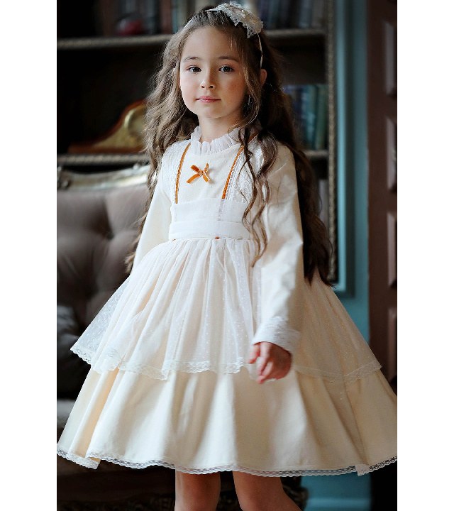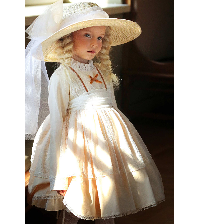 Выполнено  из мягкой плотной саржи (100 % хлопок) и дополнено тюлем кремового цвета и восхитительными  кружевными деталями на лифе, манжетах и юбочке.
