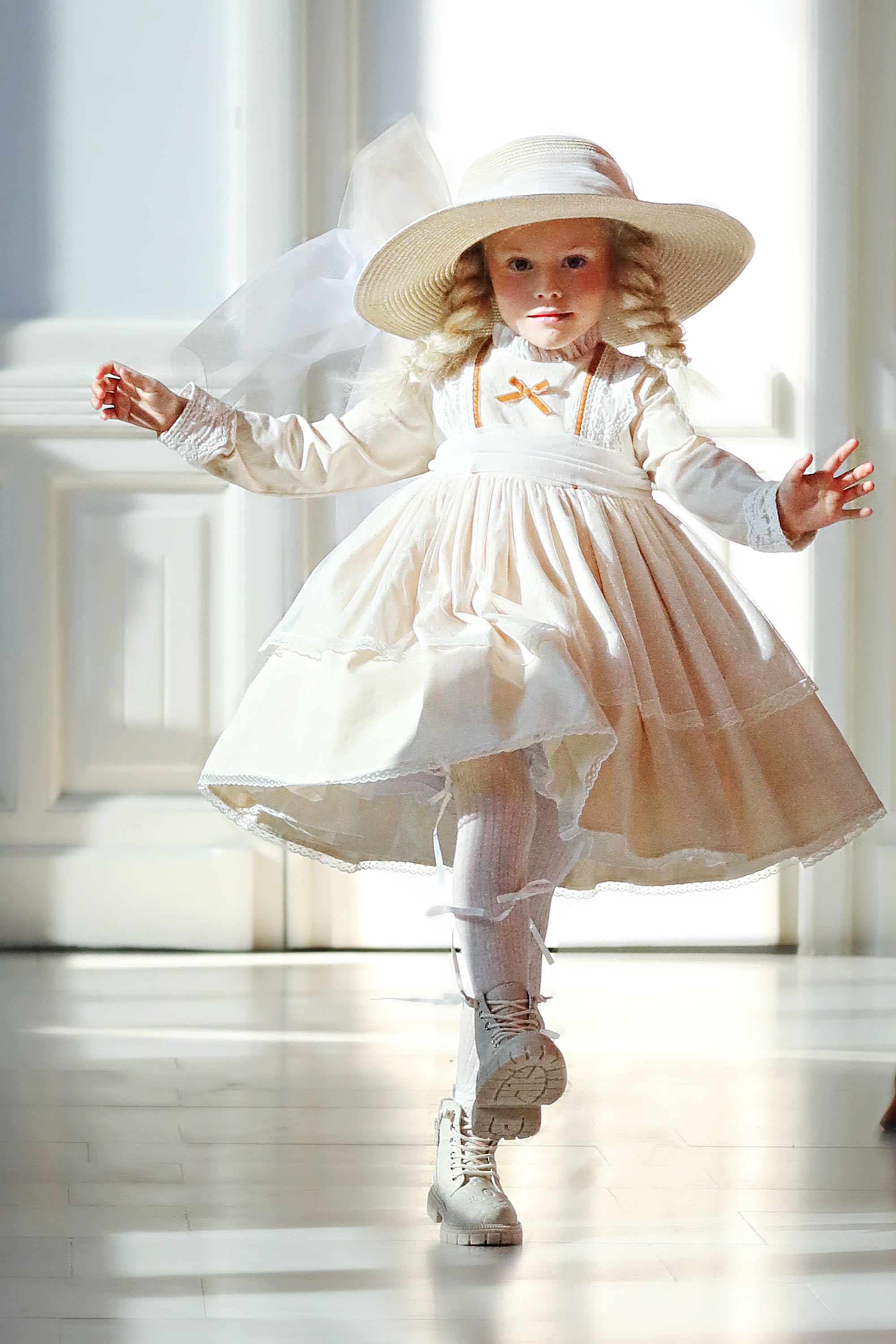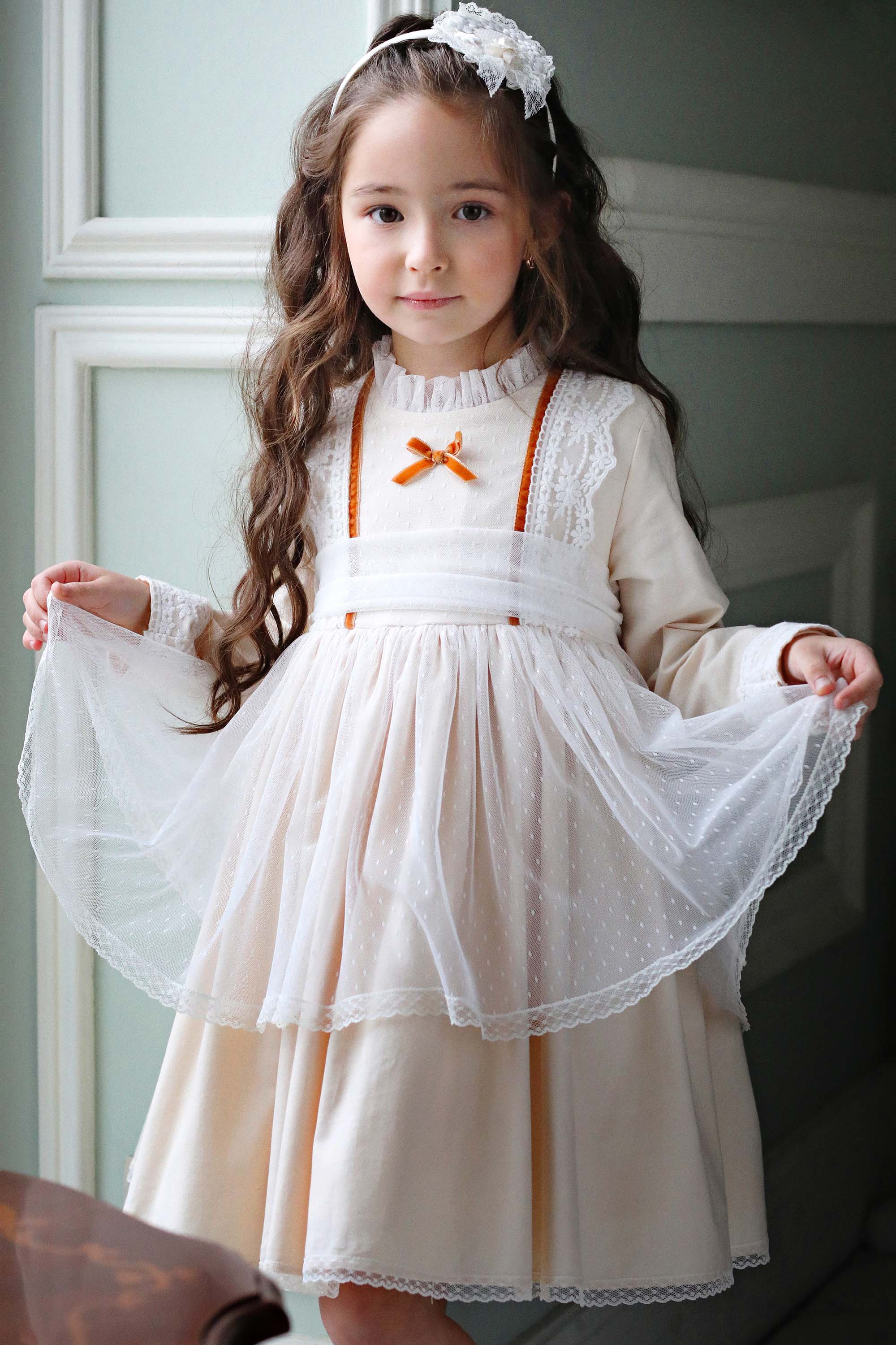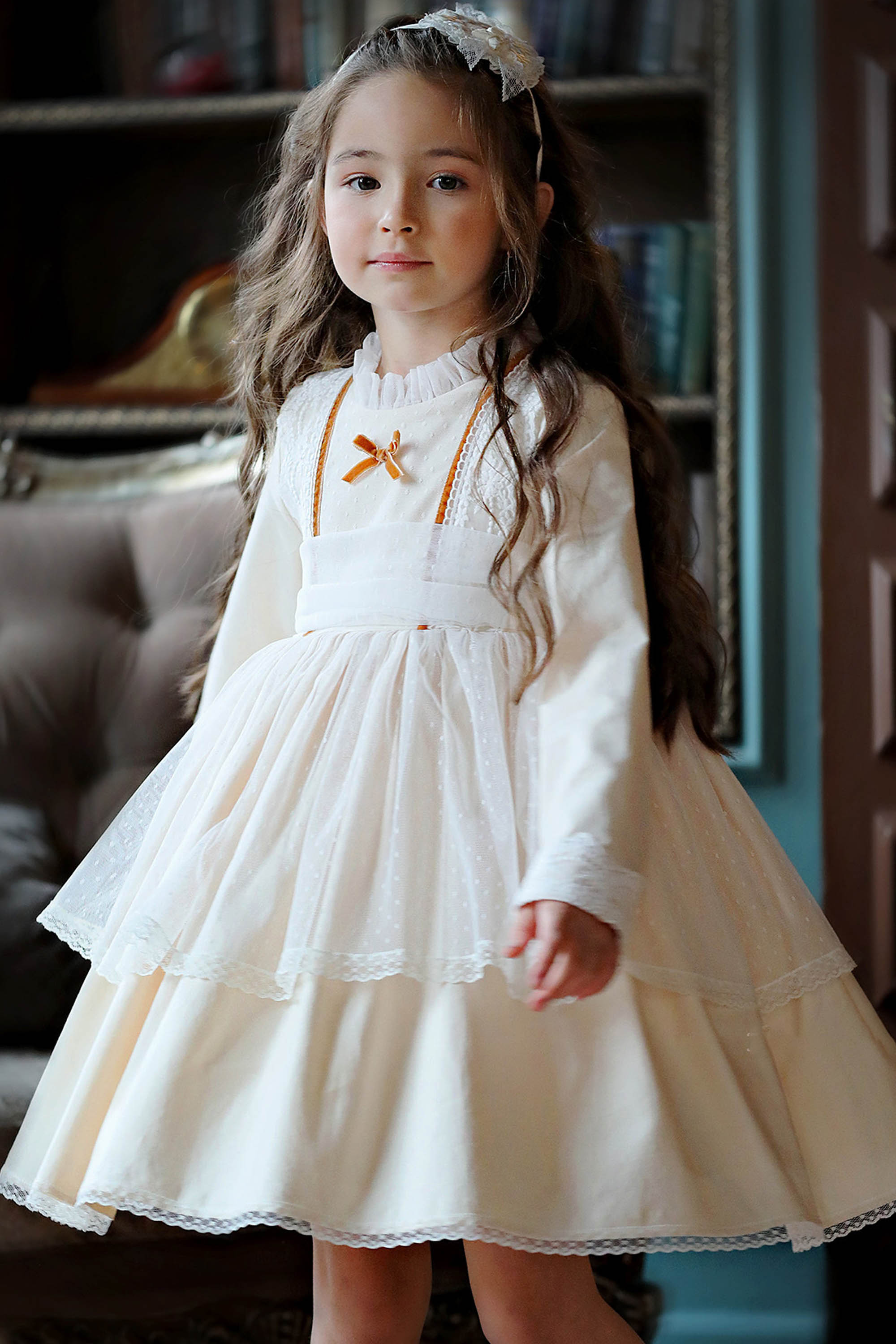 Спереди отделка бархатным бантиком и лентами цвета карамели . Воротник-стоечка из тюля в горошек и фиксированный красивый бант на спинке придают модели особенное очарование.