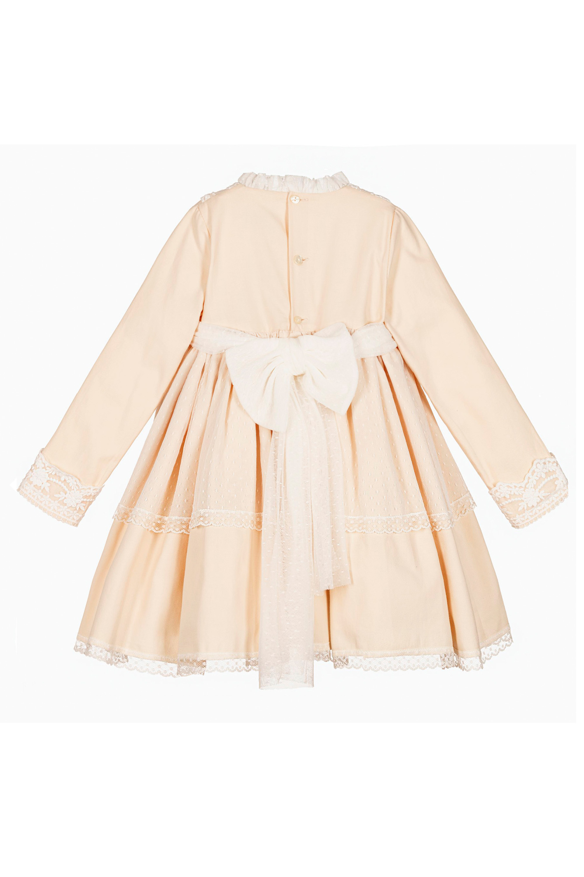 Подкладка из вуали из хлопчатобумажной смеси отделана оборками, создающими пышную юбочку классического силуэта. Платье застегивается на перламутровые пуговицы на спинке.