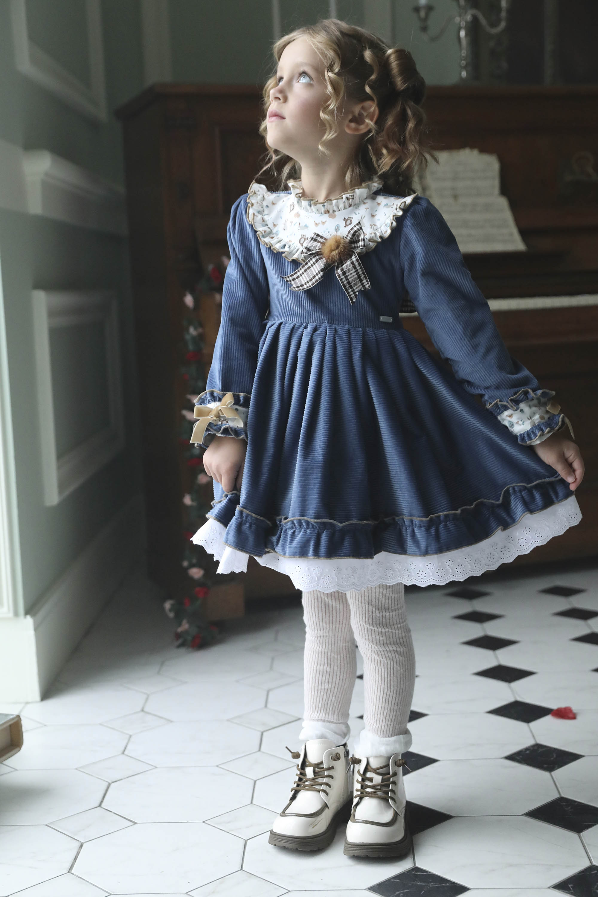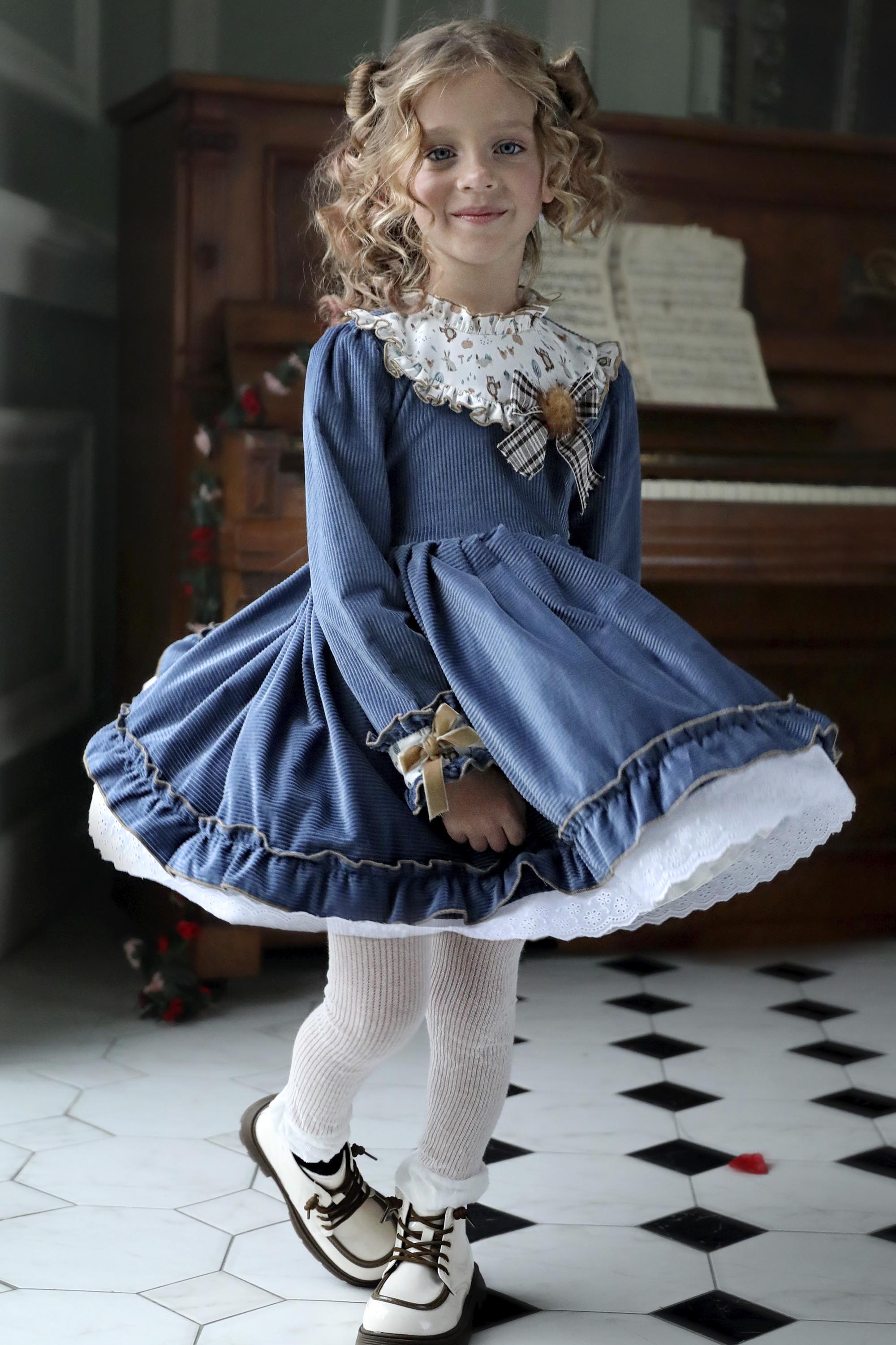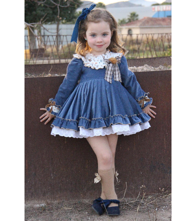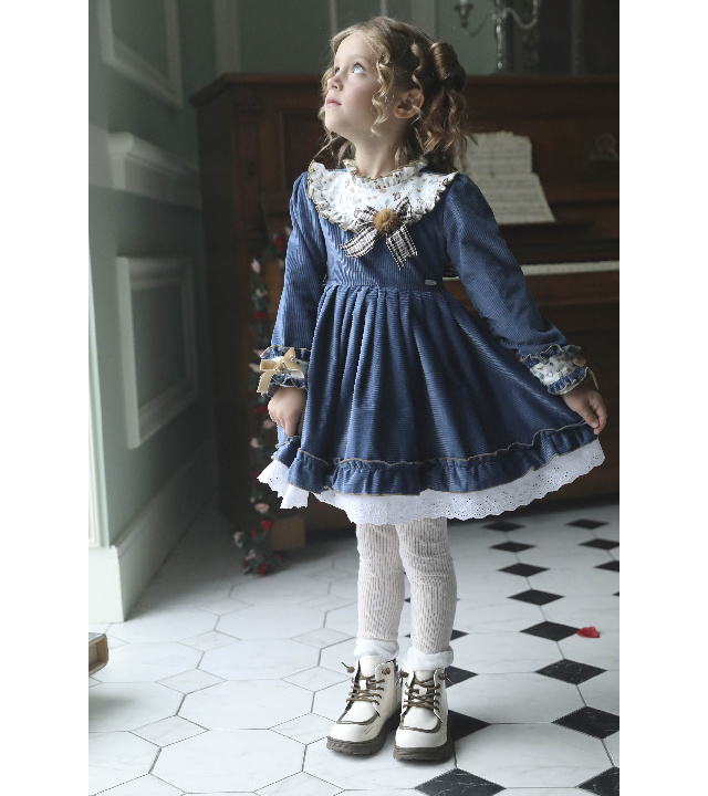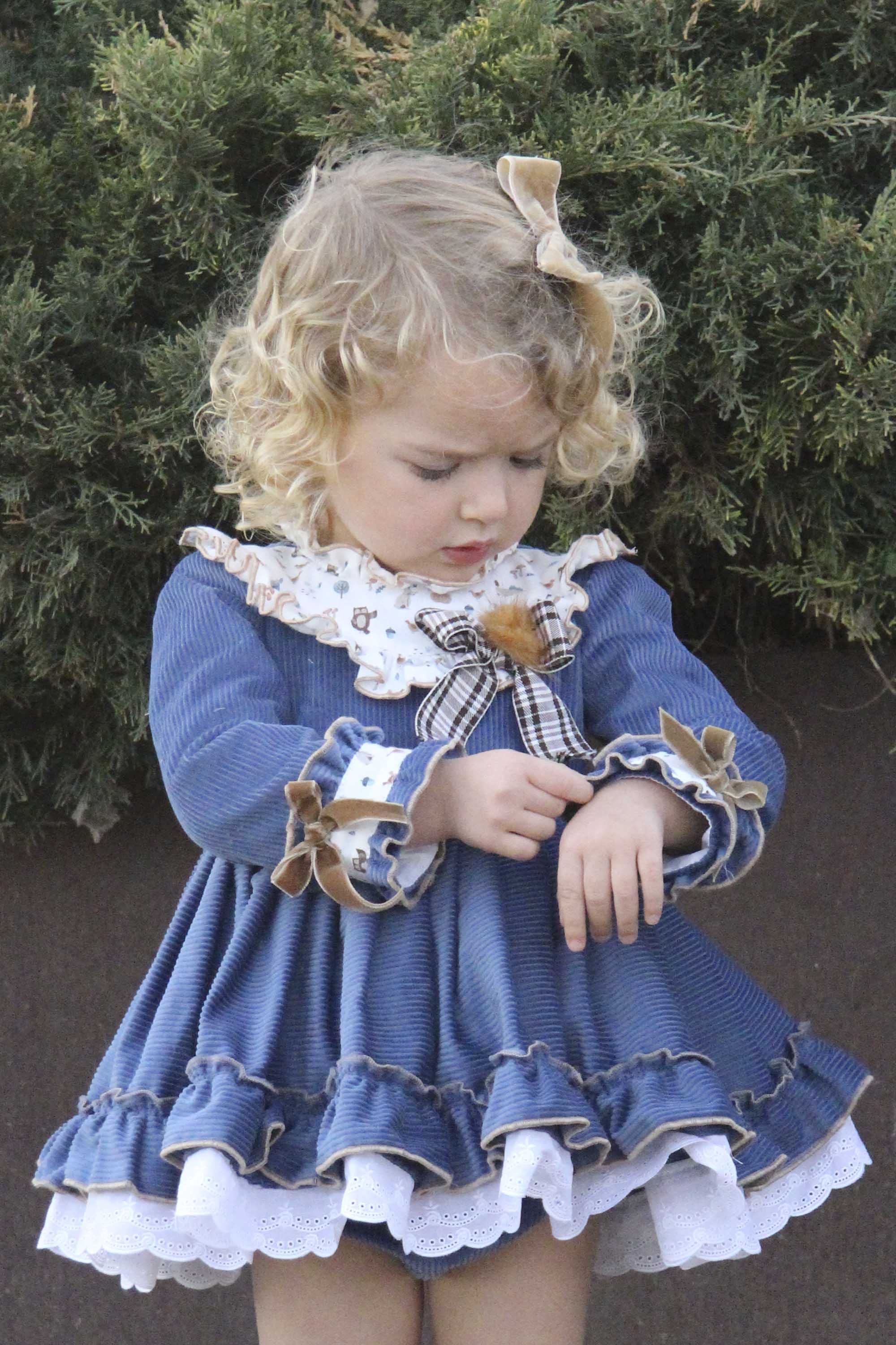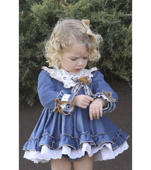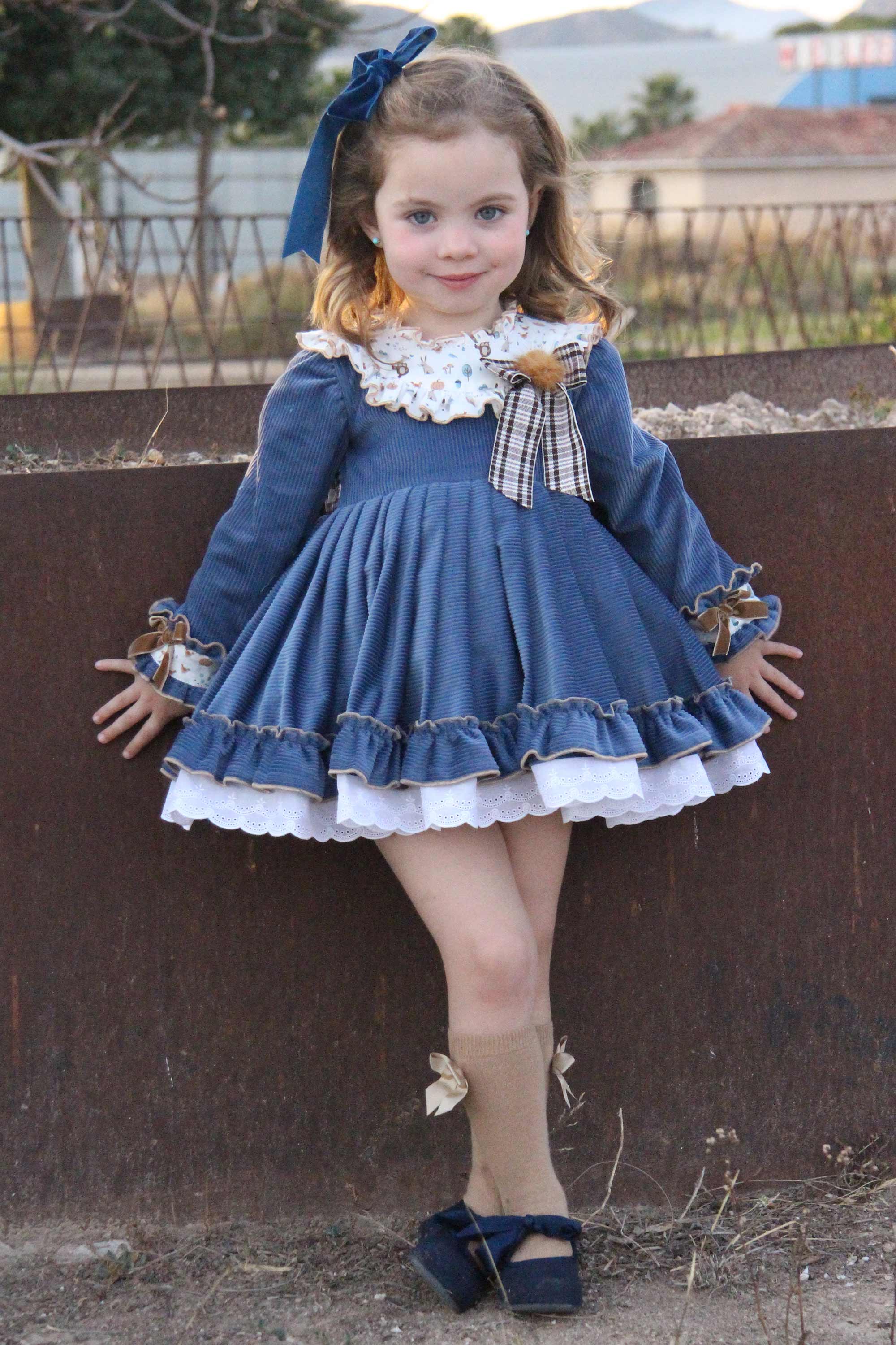 Выполнено из роскошного вельвета в широкий рубчик красивого синего оттенка. Отделка - белоснежная кружевная нижняя юбка, вставки на груди и манжетах  из белого хлопка с принтом в виде лесных зверушек, чудесные бархатные бантики и меховой помпончик .